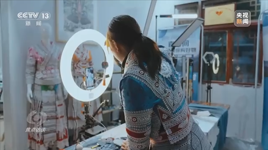 △化屋村苗繡產(chǎn)業(yè)帶頭人楊文麗在網(wǎng)絡直播間直播。