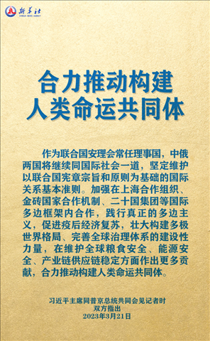 在此次訪問中,無論是在兩國領導人簽署的《中華人民共和國和俄羅斯聯(lián)邦關于深化新時代全面戰(zhàn)略協(xié)作伙伴關系的聯(lián)合聲明》中,還是在習近平主席同普京總統(tǒng)共同會見記者時,構建人類命運共同體理念都是重要主題。