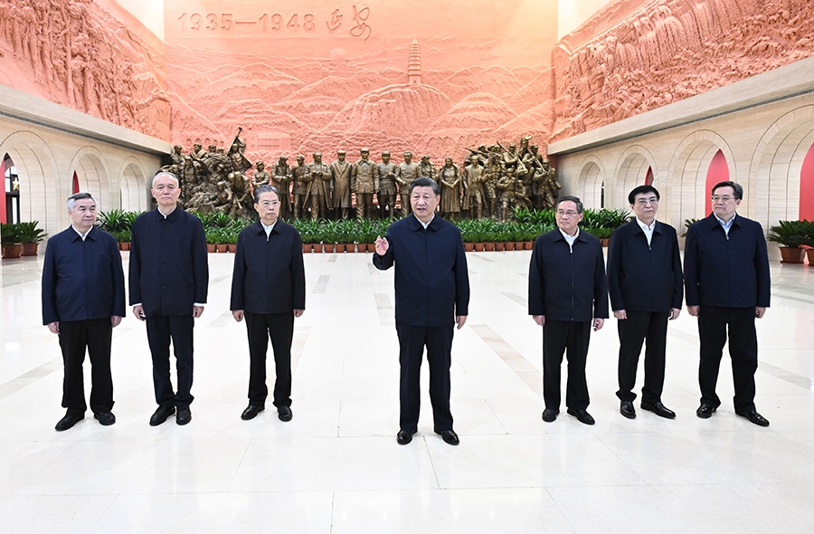 2022年10月27日,中共中央總書記、國(guó)家主席、中央軍委主席習(xí)近平帶領(lǐng)中共中央政治局常委李強(qiáng)、趙樂際、王滬寧、蔡奇、丁薛祥、李希,瞻仰延安革命紀(jì)念地。這是習(xí)近平在延安革命紀(jì)念館參觀《偉大歷程——中共中央在延安十三年歷史陳列》結(jié)束時(shí)發(fā)表重要講話。 新華社記者 燕雁/攝