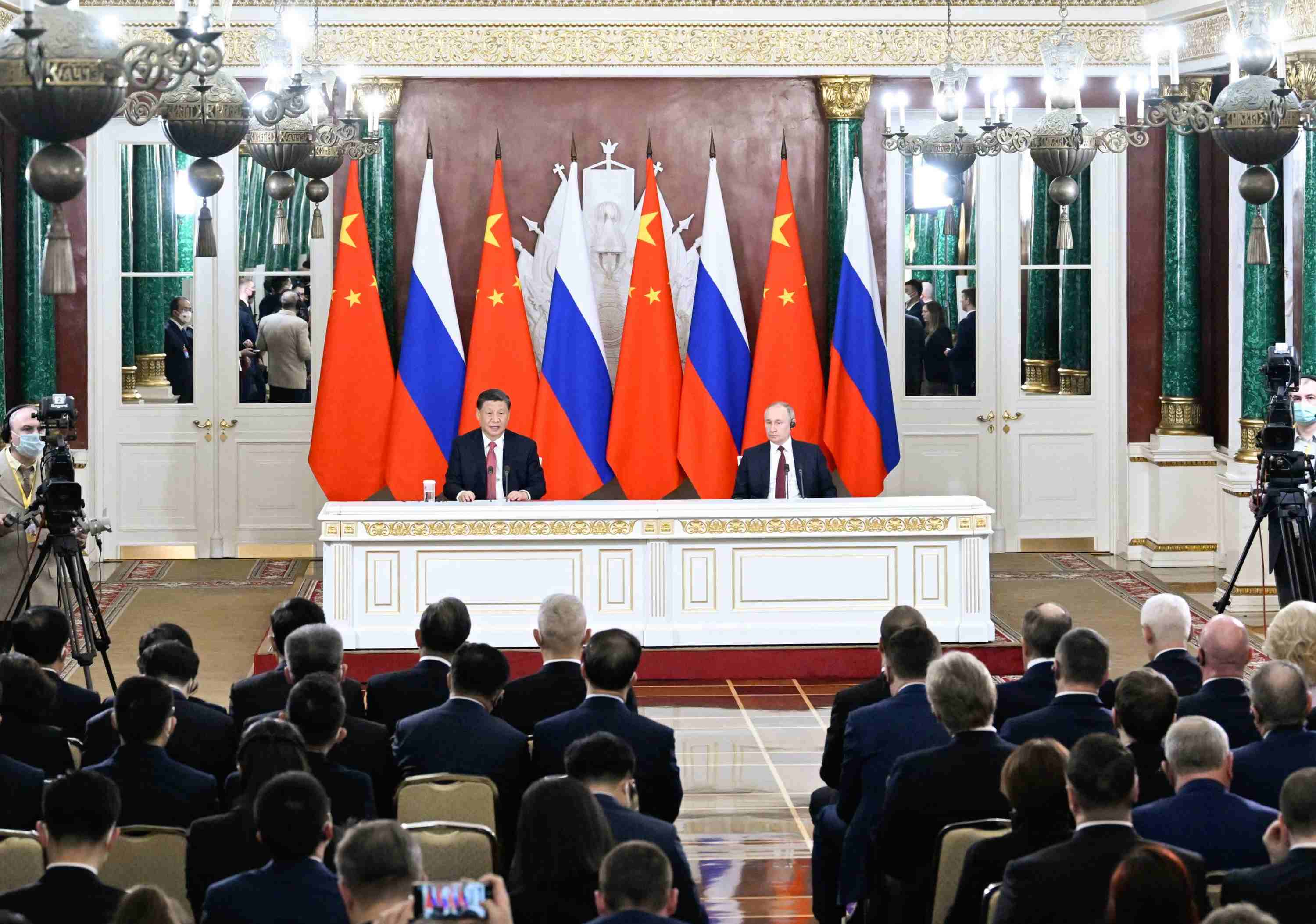 當(dāng)?shù)貢r間3月21日下午,國家主席習(xí)近平在莫斯科克里姆林宮同俄羅斯總統(tǒng)普京舉行會談。這是會談后,兩國元首共同會見記者。