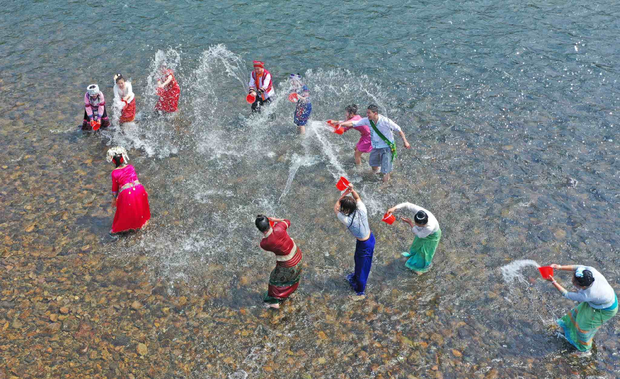 2023年4月12日,浙江臺州,仙居縣永安溪畔,傣族同胞正在參加潑水狂歡活動。視覺中國