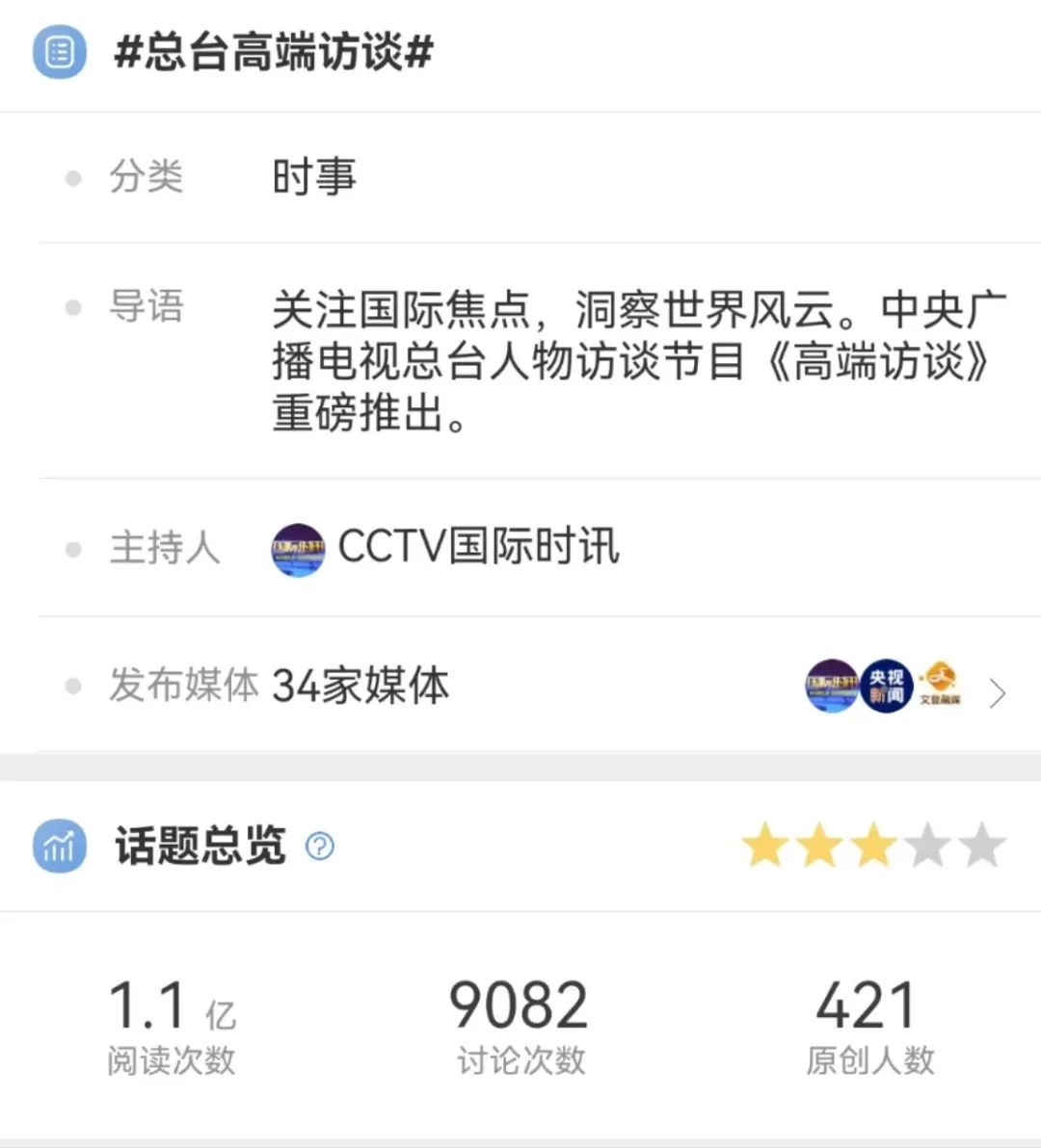 開播以來,《高端訪談》節(jié)目在海內外廣泛傳播,獲得國際社會廣泛關注。多國主流媒體第一時間播發(fā)節(jié)目及相關報道。