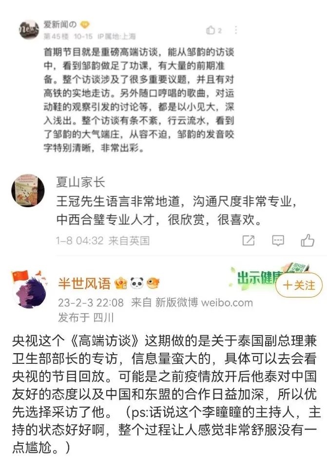 從首期專訪印度尼西亞總統(tǒng)佐科的節(jié)目開始,《高端訪談》立足真實、深挖細節(jié)、引發(fā)共鳴的欄目調性就越發(fā)清晰和堅定。節(jié)目中,總臺主持人鄒韻從佐科的從政理想入手,圍繞印尼的基礎設施建設、中國印尼合作的雅萬高鐵、中國提出的“一帶一路”倡議、兩國經(jīng)貿合作等話題,與佐科深入交流。網(wǎng)友稱贊這次專訪“展現(xiàn)了大國新聞主持的水平”“打開了中國與世界溝通的新視角”。