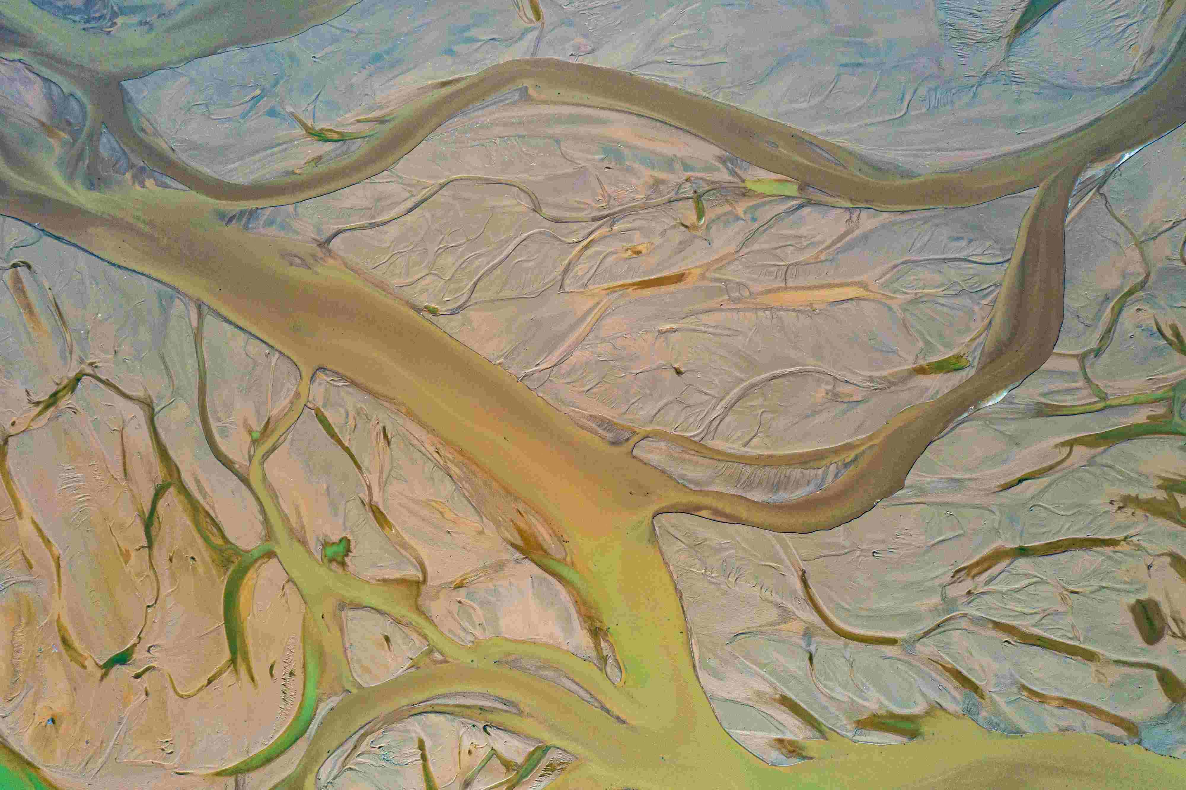 4月16日,山西運(yùn)城,由于黃河上游降雨和庫區(qū)泄水水量增加,黃河永濟(jì)段河床在水流沖刷下河汊縱橫,高空俯瞰宛若“大地血脈”。 視覺中國