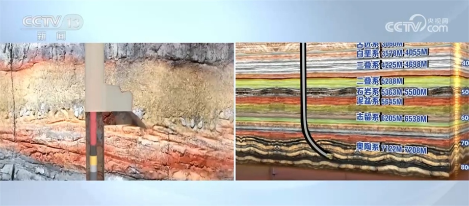 為了讓大家更好地理解鉆井工作,我們借助虛擬技術(shù)制作了一個(gè)地層結(jié)構(gòu)圖。開鉆施工后,將從新近系開始,陸續(xù)穿越古近系、白堊系、三疊系等,最后到達(dá)奧陶系,總共要經(jīng)過(guò)9個(gè)地層,最后來(lái)到9472米的油層深處。