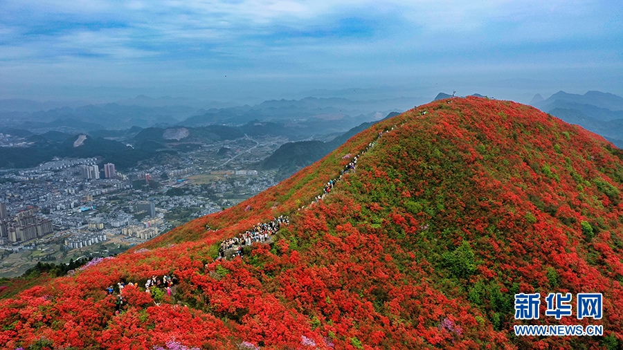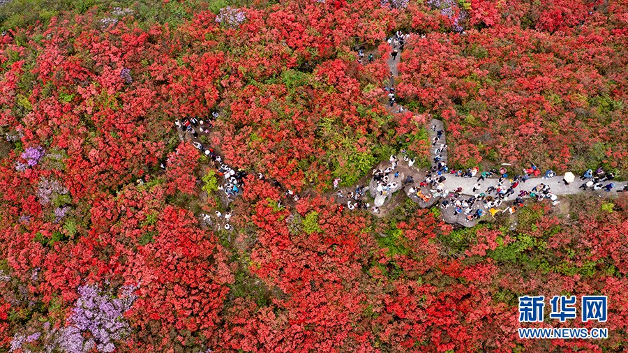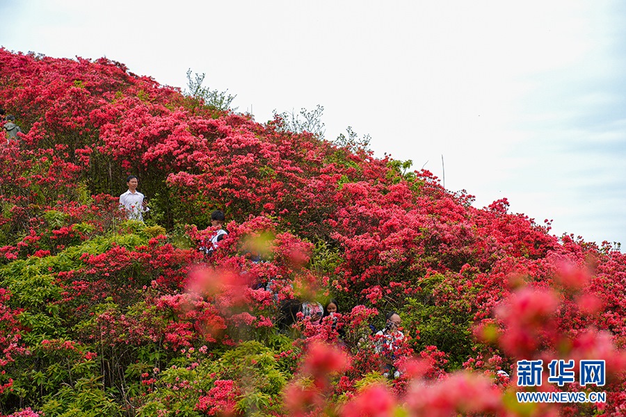 當(dāng)日,在貴州省黔東南苗族侗族自治州丹寨縣縣城邊海拔1400多米的龍泉山,萬(wàn)畝杜鵑花競(jìng)相綻放,山谷間、棧道旁、懸崖上,一顆顆、一簇簇、一朵朵杜鵑花迎風(fēng)搖曳,形成浩瀚花海,引來(lái)眾多游客登高望遠(yuǎn),飽覽靈山秀水之美。