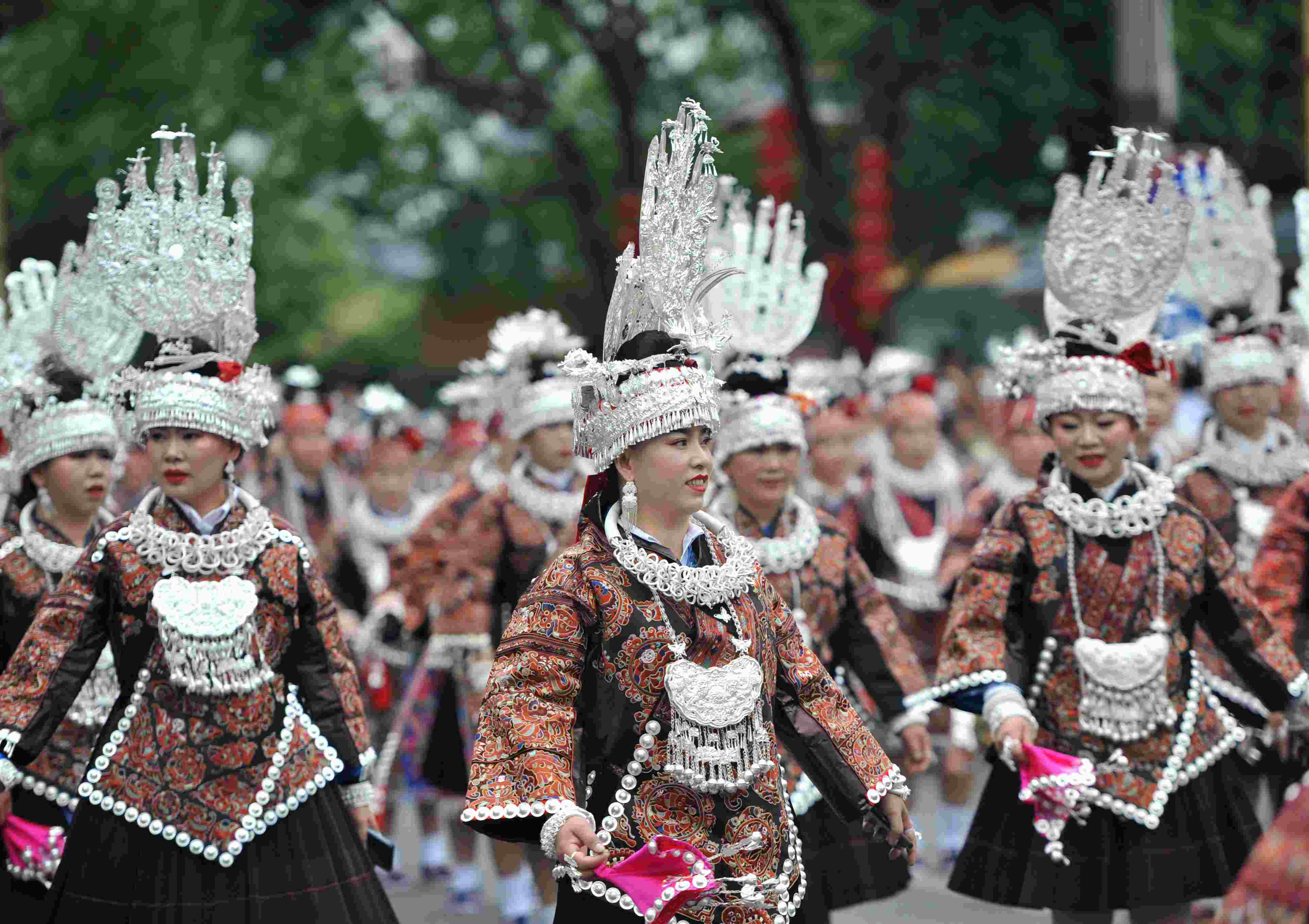 2023年5月2日,貴州省臺(tái)江縣,苗族女子盛裝參加“姊妹節(jié)”游演。