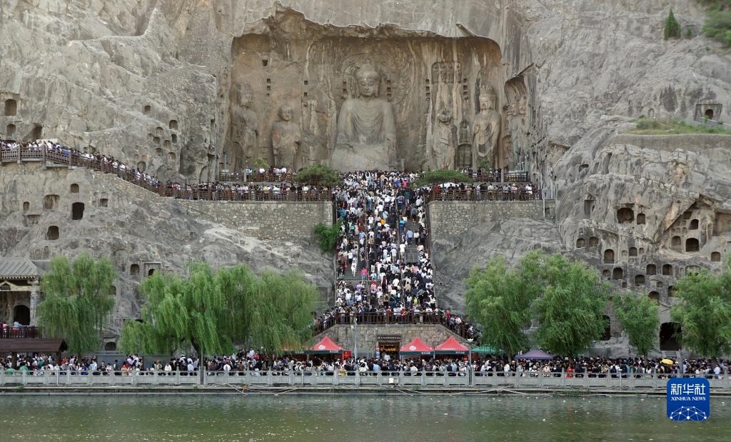 4月30日,游客在河南洛陽龍門石窟景區(qū)游覽。