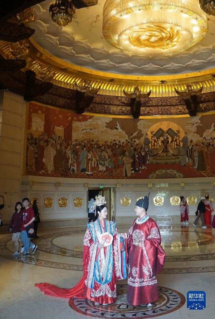 5月1日,兩名古裝愛好者在河南洛陽隋唐洛陽城國家遺址公園留影。