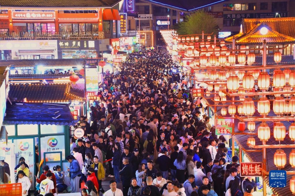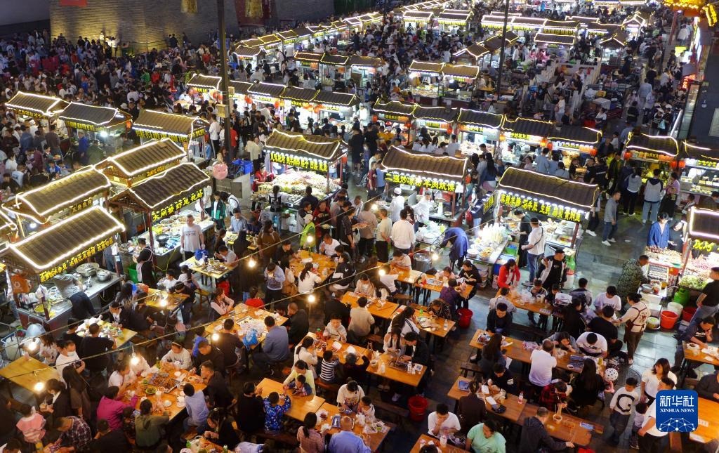 4月30日,游客在河南省開封市鼓樓夜市品嘗小吃。