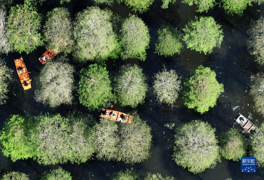 5月1日,游客在江蘇省揚(yáng)州市淥洋湖濕地公園的水上森林乘船游覽(無人機(jī)照片)。