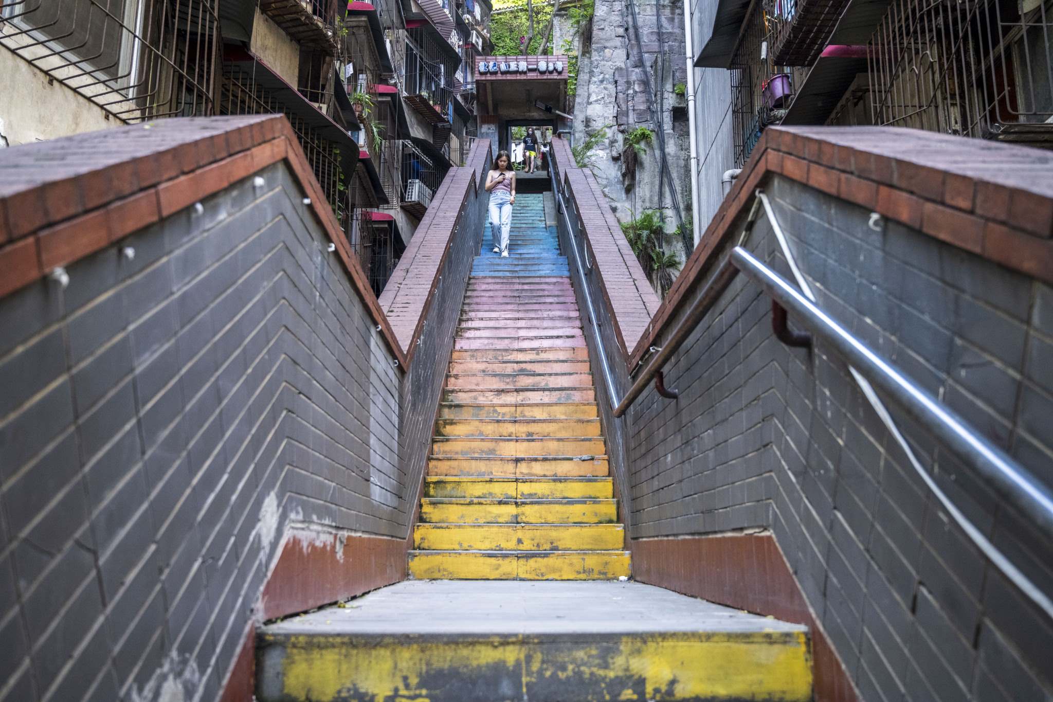 “彩虹樓梯”位于重慶渝中區(qū)枇杷山正街的居民樓間,高約20米,共有50多級階梯,極具山城特色。經(jīng)過多種顏色涂鴉后,吸引不少市民和攝影愛好者“打卡”。視覺中國