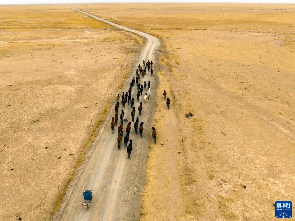 5月3日,在阿克塞縣阿伊納鄉(xiāng)海子草原,馬群轉(zhuǎn)場(chǎng)去往夏季牧場(chǎng)。