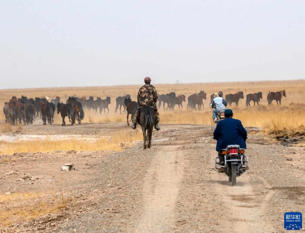 5月3日,在阿克塞縣阿伊納鄉(xiāng)海子草原,牧民趕著馬群進(jìn)行轉(zhuǎn)場(chǎng)。