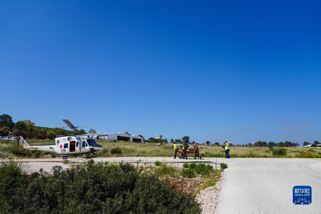 5月3日,在黎巴嫩南部邊境“藍(lán)線”附近雷場,參與演習(xí)的中國第21批赴黎巴嫩維和多功能工兵分隊隊員使用救援直升機轉(zhuǎn)運“傷員”。