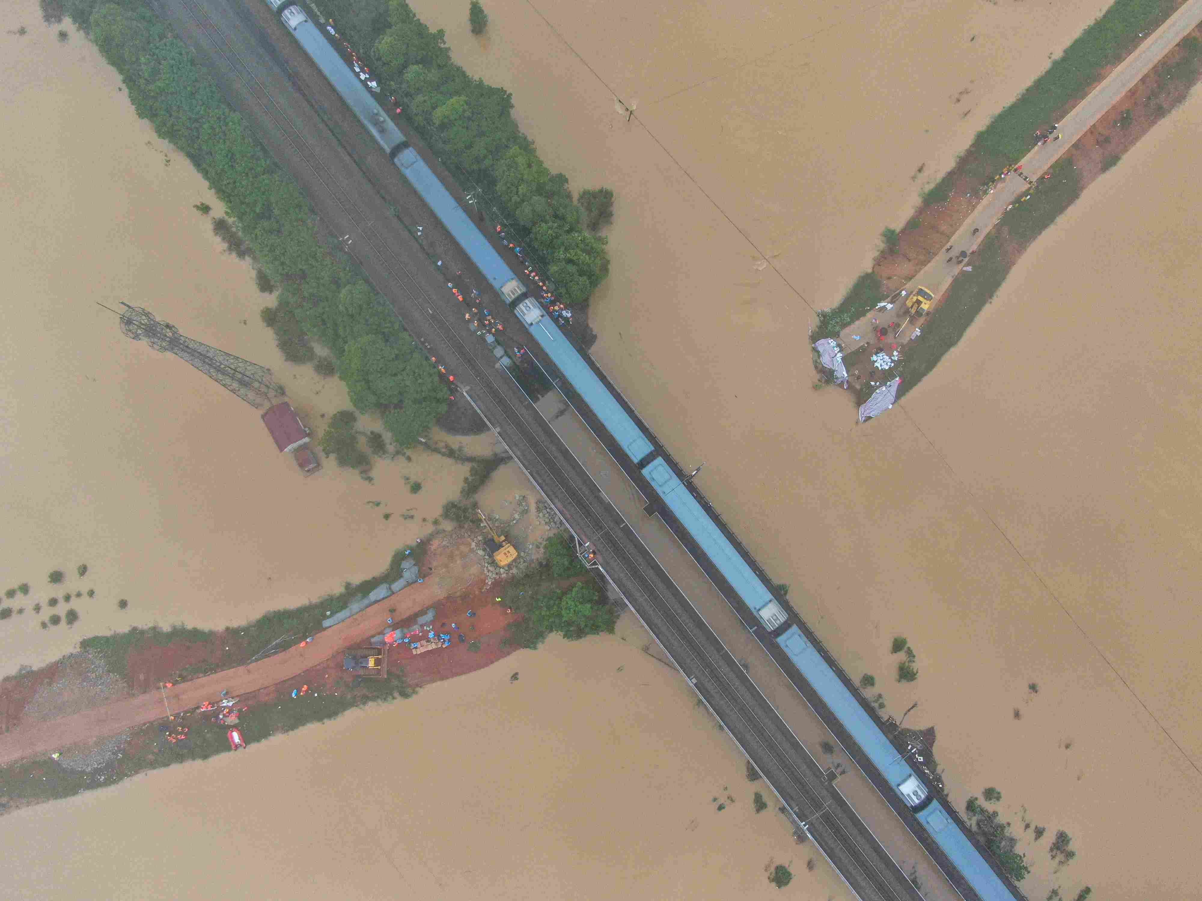 2023年5月6日,江西宜春,航拍清豐堤河堤潰口現場,一列火車從潰口上方的鐵路橋上經過,橋下的救援隊伍正在開展搶險救援工作。 視覺中國