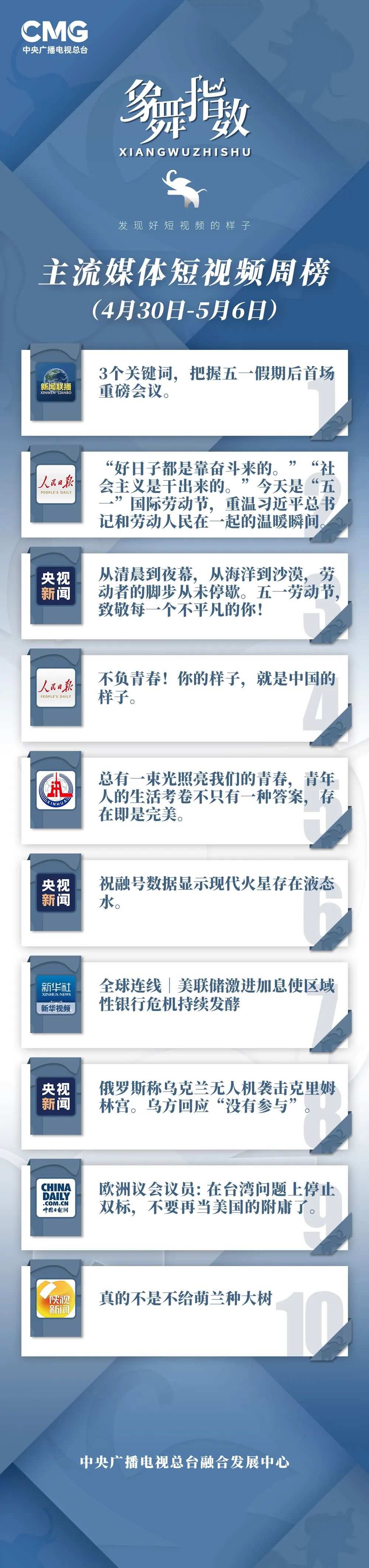 中央廣播電視總臺“象舞指數(shù)”評議品牌,推出主流媒體短視頻周榜、總臺短視頻周榜。在2023年4月30日—5月6日,這些內(nèi)容引發(fā)大眾關(guān)注: