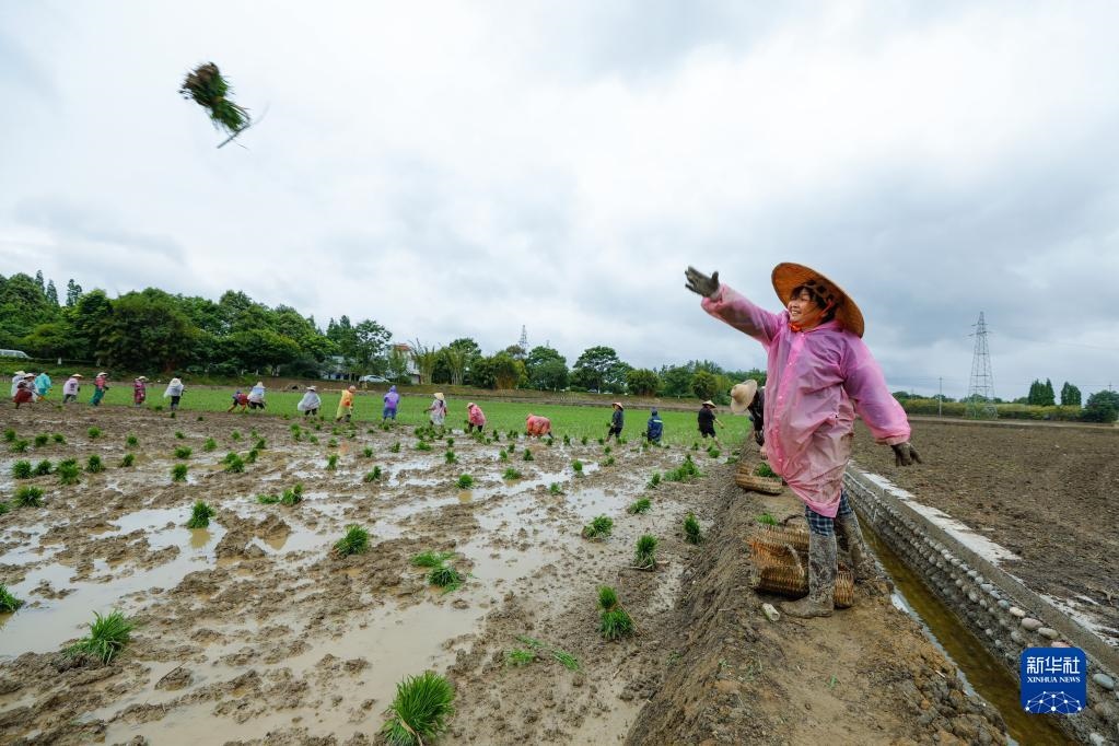5月9日,在四川省崇州市道明鎮(zhèn)協(xié)和社區(qū),農(nóng)民向一片高標(biāo)準(zhǔn)農(nóng)田里拋水稻秧苗,以方便其他農(nóng)民插秧。