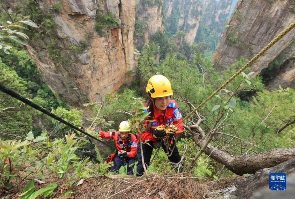 5月14日,張家界市武陵源區(qū)山地應(yīng)急救援隊隊員在天子山的絕壁間索降。