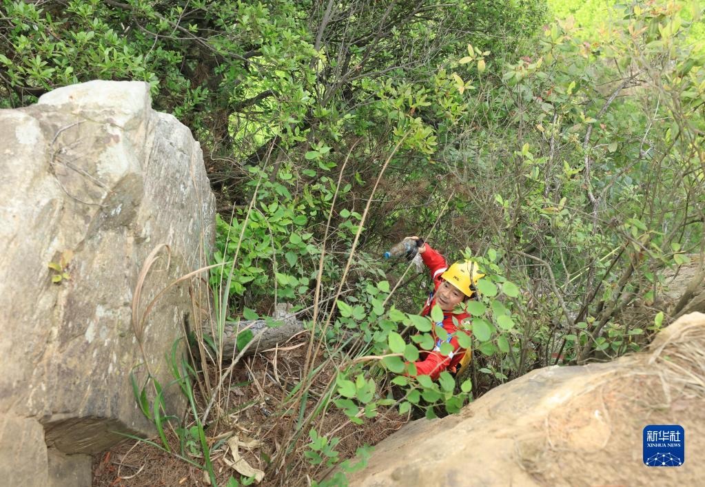 5月14日,張家界市武陵源區(qū)山地應(yīng)急救援隊隊員在叢林中撿拾垃圾。