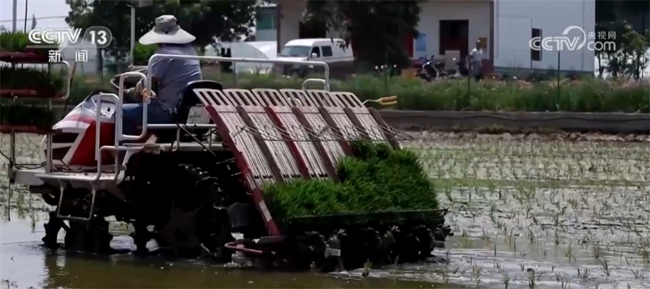 在四川廣安, 眼下正是水稻移栽的關(guān)鍵時(shí)期,在廣安市一處工廠化育秧車間里,工作人員將一盤(pán)盤(pán)秧苗從輸送帶上取下來(lái),再送到需要插秧的水田里。工廠化育秧不僅可以縮短水稻育秧時(shí)長(zhǎng),還能提高秧苗抗病蟲(chóng)害能力。
