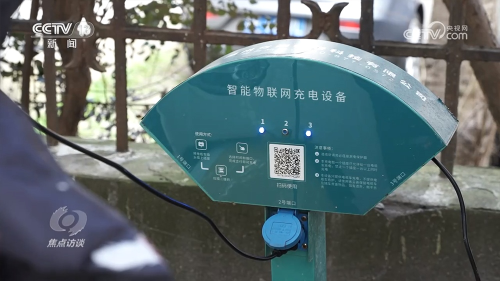 黃永強:“車庫后來我們進行了改造,把面積擴大了。同時,在車庫內(nèi)和車庫外裝了智能充電樁,一般電動自行車充5個小時足夠了,到了5個小時之后自然會斷電,就很安全了。而且費用政府也補貼,自己出4毛5,政府也出4毛5。”