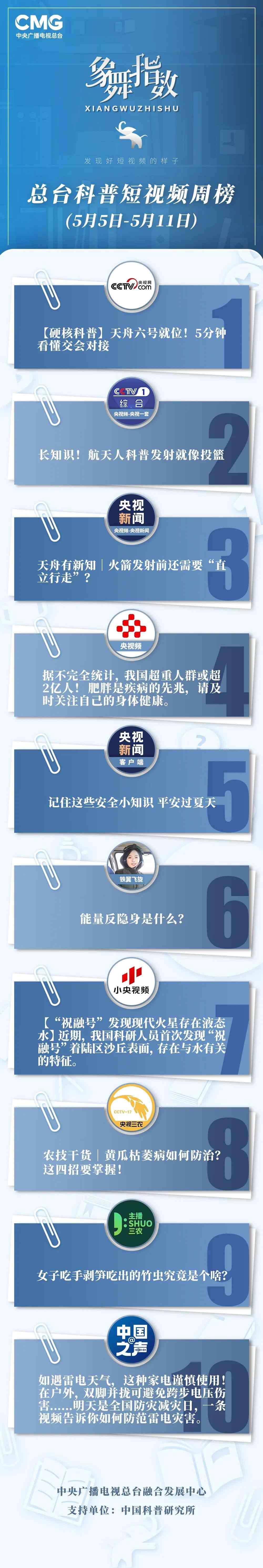 中央廣播電視總臺“象舞指數(shù)”評議品牌,推出科普短視頻周榜、總臺科普短視頻周榜。在2023年5月5日-5月11日,值得注目的內(nèi)容有: