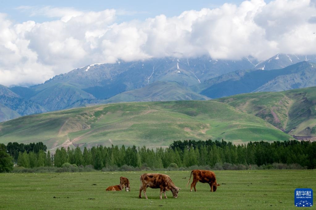 5月20日,在那拉提草原上,幾頭牛在吃草。   新華社記者 王菲 攝