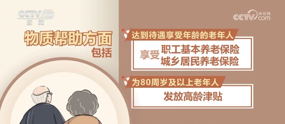 物質幫助方面包括:達到待遇享受年齡的老年人享受職工基本養(yǎng)老保險和城鄉(xiāng)居民養(yǎng)老保險;為80周歲及以上老年人發(fā)放高齡津貼;為經濟困難的老年人提供養(yǎng)老服務補貼;為經認定生活不能自理的老年人提供護理補貼;為納入最低生活保障范圍的老年人提供最低生活保障;經認定符合條件的殘疾老年人享受困難殘疾人生活補貼和重度殘疾人護理補貼;對生活無著的流浪、乞討老年人依照有關規(guī)定給予救助。