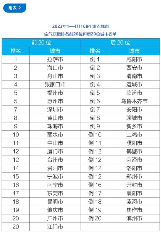 1—4月,168個重點城市中,拉薩、??诤椭凵降瘸鞘锌諝赓|量相對較好(從第1名至并列第20名);咸陽、西安和渭南等城市空氣質量相對較差(從倒數第1名至倒數第20名)。