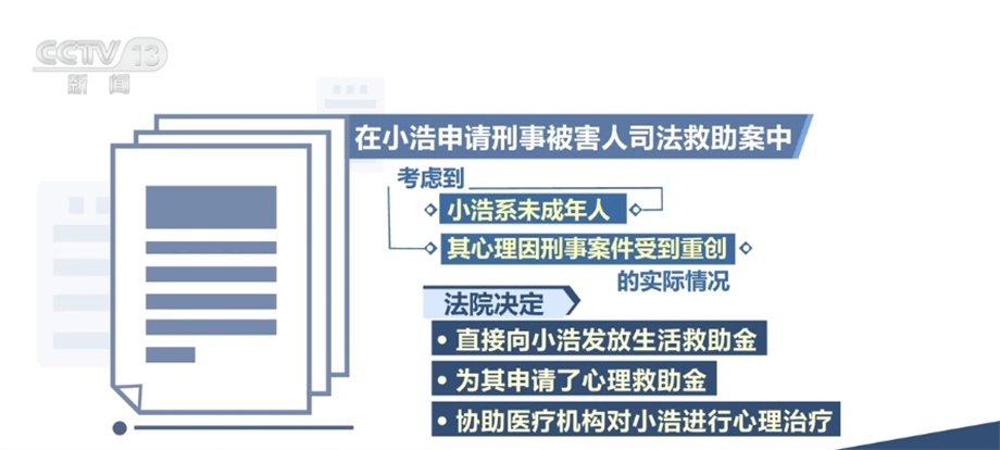 在此次發(fā)布的保護未成年人權(quán)益司法救助典型案例中,還涉及針對向未成年人提供專門心理救助金、提供心理危機干預(yù)等立體幫扶,進一步延伸司法服務(wù)。在小浩申請刑事被害人司法救助案中,小浩的父親被害,其本人亦受到人身傷害,法院作出刑事附帶民事判決,判處被告人死刑,并判決其賠償附帶民事訴訟原告人經(jīng)濟損失13萬余元。后經(jīng)調(diào)查,被告人無財產(chǎn)可供執(zhí)行。考慮到小浩系未成年人,其心理因刑事案件受到重創(chuàng)的實際情況,法院除決定直接向小浩發(fā)放生活救助金外,還為其申請了心理救助金,協(xié)助醫(yī)療機構(gòu)對小浩進行心理治療。