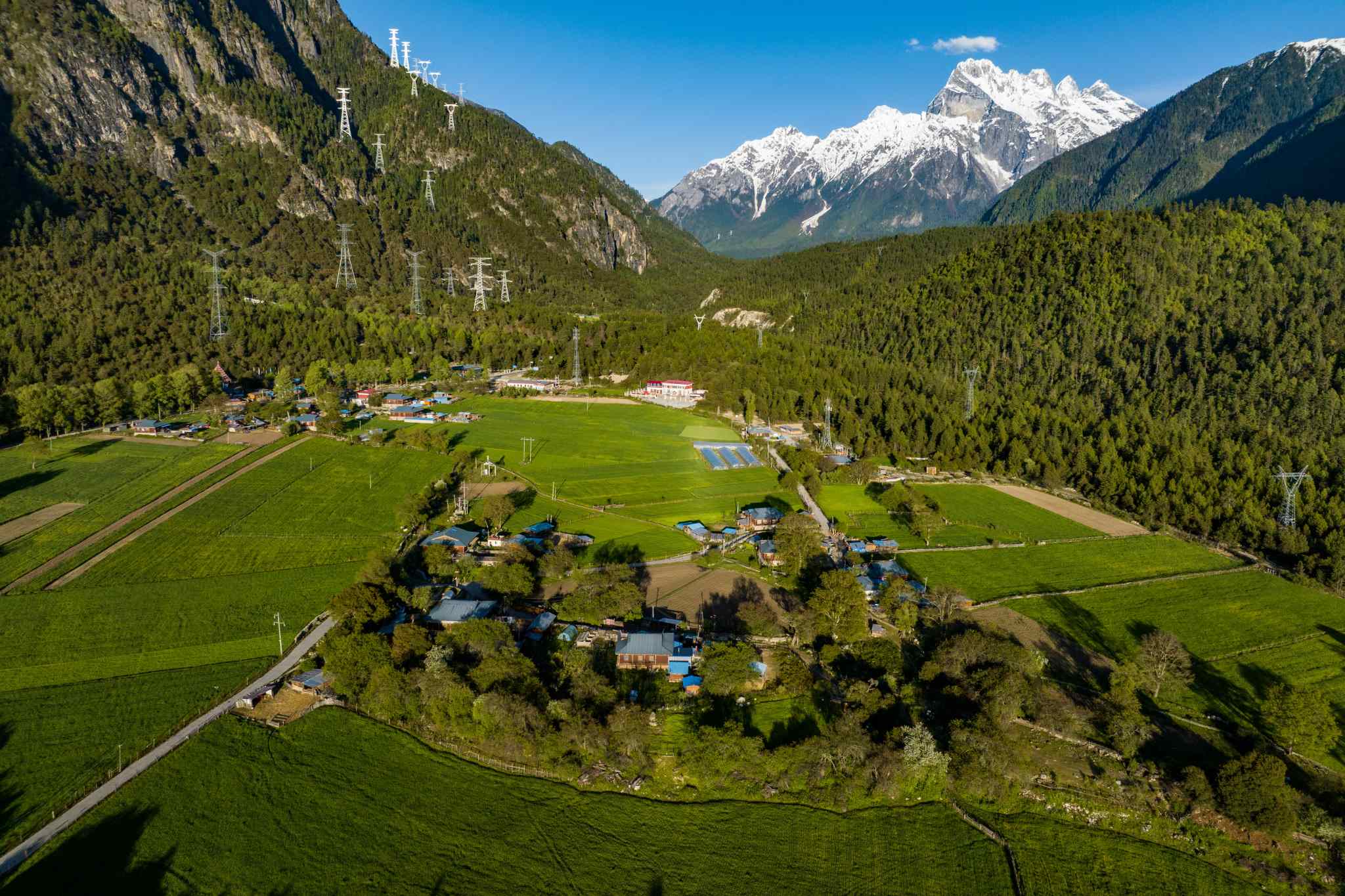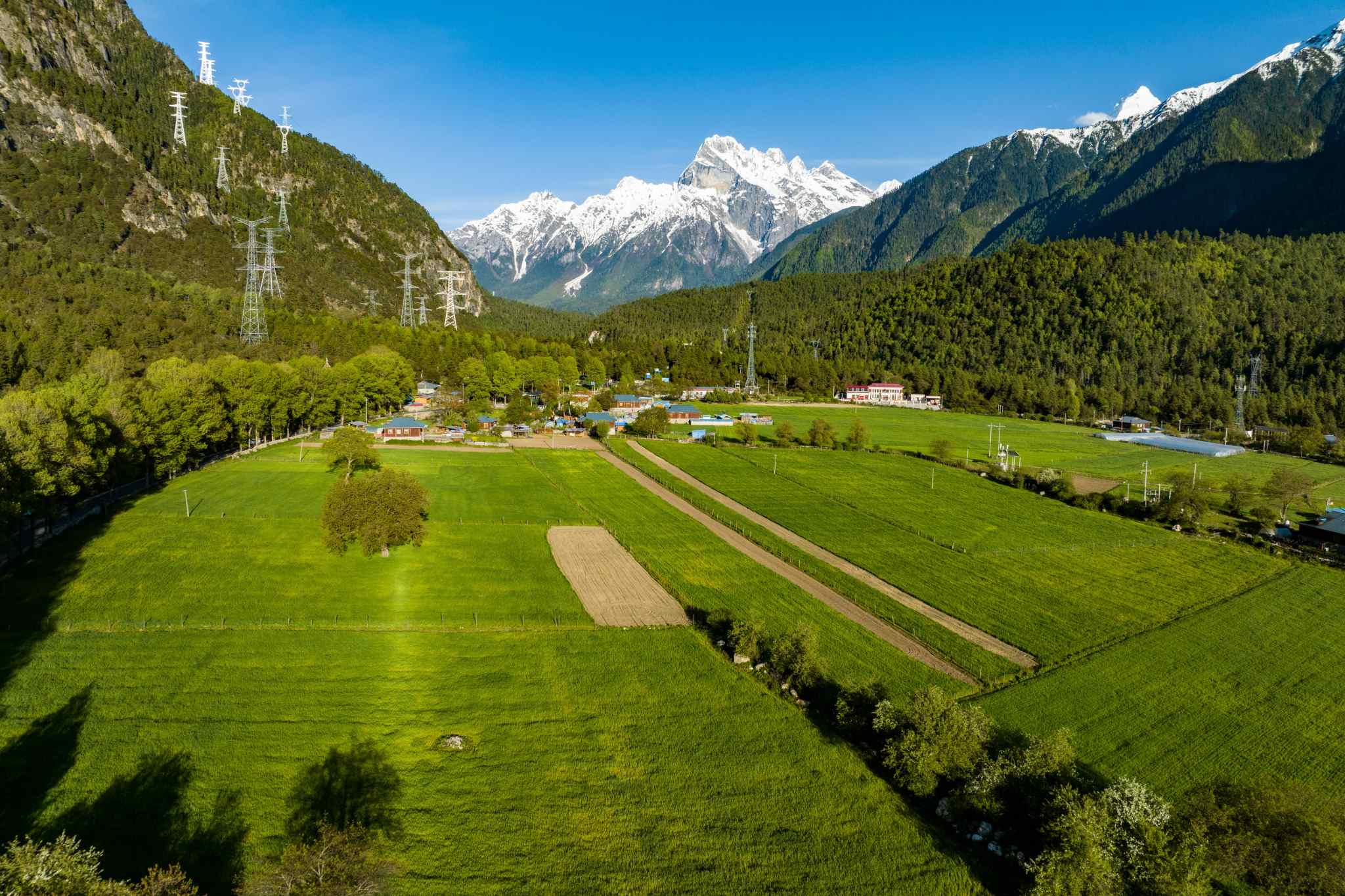 2023年5月24日,西藏林芝,波密縣松宗鎮(zhèn)龍亞村,民居、樹木和遠處的雪山相映成趣。視覺中國