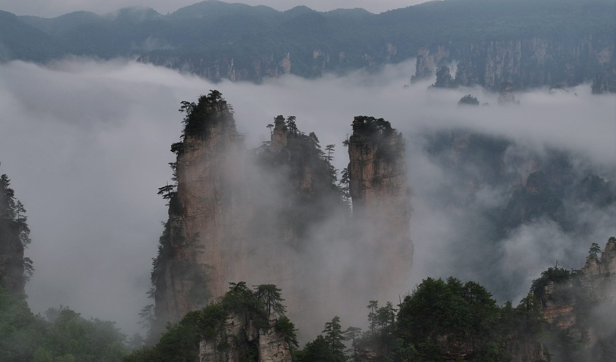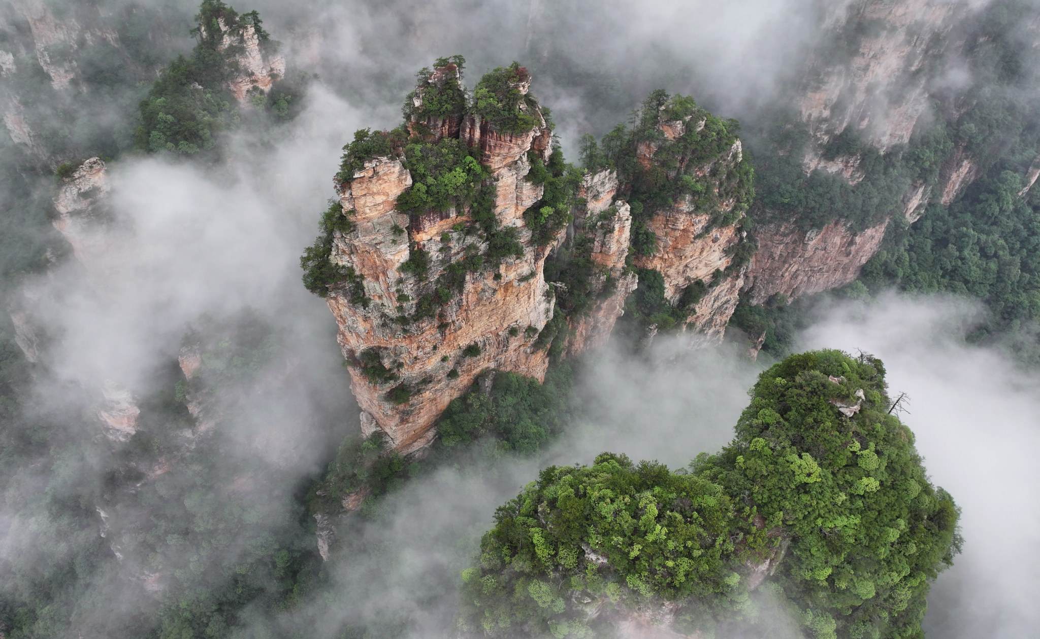 2023年5月27日,湖南張家界,國家森林公園天子山、十里畫廊出現(xiàn)雨后云海勝景,云霧在峰林間變幻飄逸,宛如水墨畫境。視覺中國