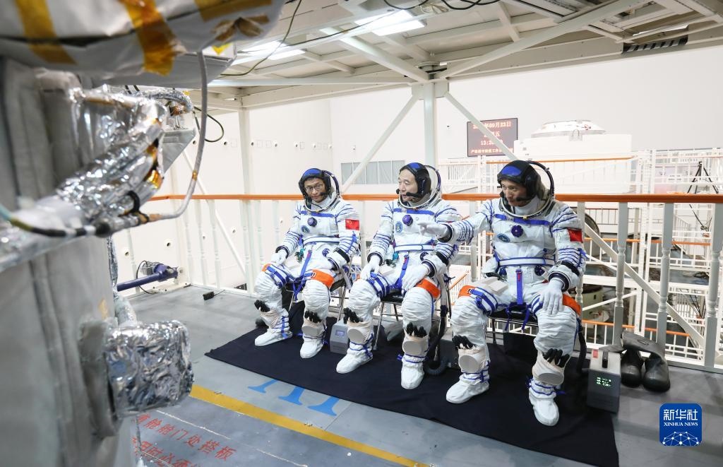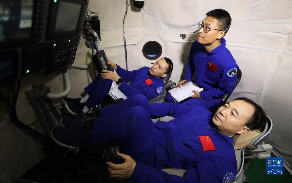 神舟十六號航天員乘組在人船合練中交流(2022年9月23日攝)。新華社發(fā)(徐部 攝)