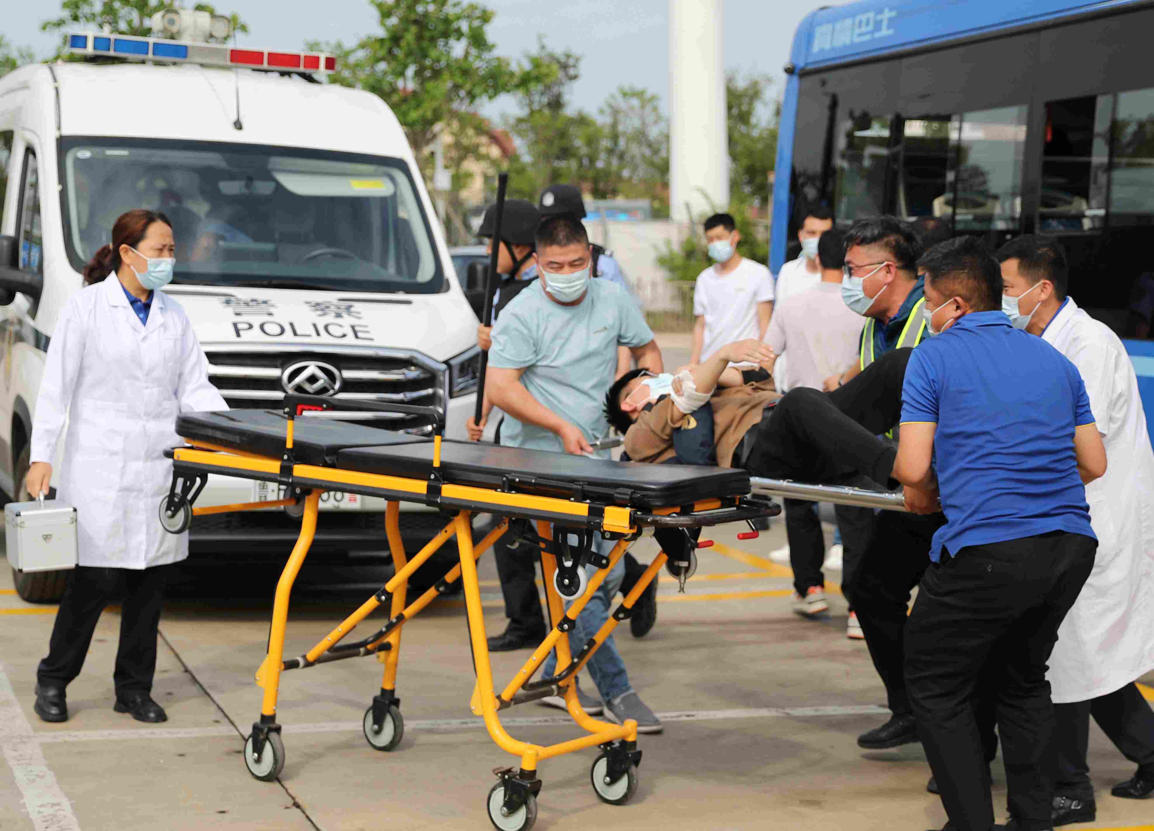 5月30日,120急救中心工作人員在進(jìn)行運(yùn)送傷員演練。(張進(jìn)剛 攝)