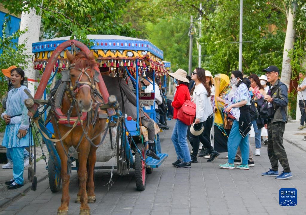 游客在新疆伊寧市喀贊其景區(qū)準(zhǔn)備乘坐馬車(chē)觀(guān)光(5月18日攝)。新華社記者 王菲 攝