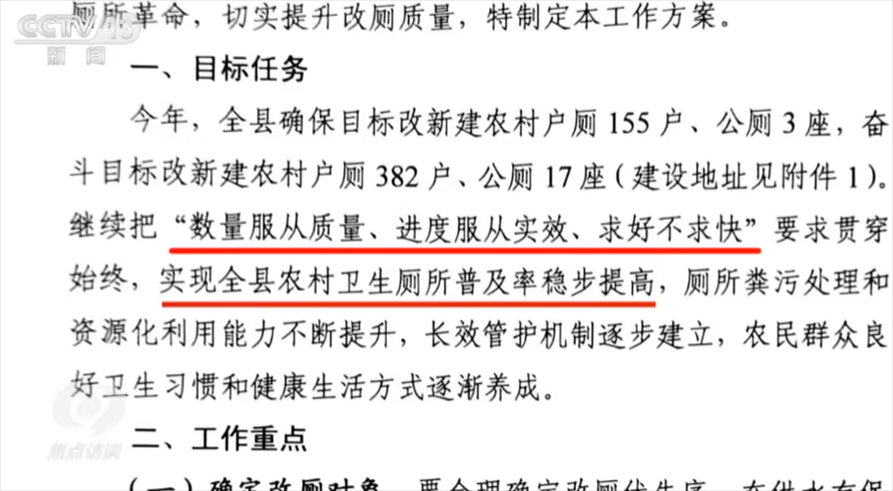 近年來,桂東縣持續(xù)加大廁改資金保障力度。政府切實投入了真金白銀,但在一些地方,廁改的成效卻打了水漂。記者拿到了《桂東縣2023年農(nóng)村“廁所革命”工作方案》,文中提出,繼續(xù)把“數(shù)量服從質量、進度服從實效、求好不求快”要求貫穿始終,實現(xiàn)全縣農(nóng)村衛(wèi)生廁所普及率穩(wěn)步提高。