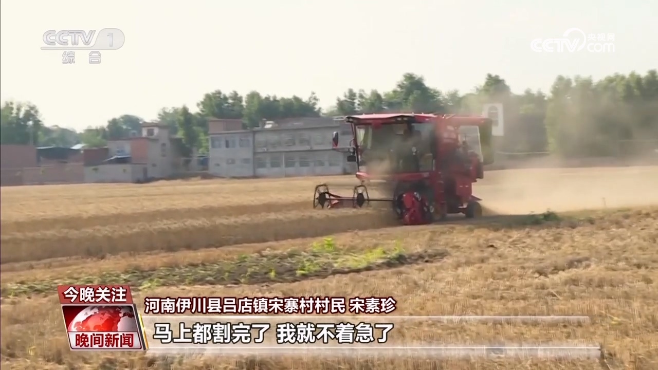伊川縣呂店鎮(zhèn)宋寨村村民 宋素珍:前幾天下雨小麥收不回來,心里可心慌,鄉(xiāng)里派履帶式收割機,我這十幾畝地馬上都挨?。ㄝ喌剑┝耍R上都割完了,我就不著急了。