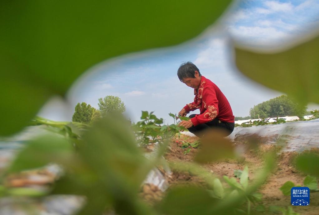 6月5日,農(nóng)民在山東省青州市高柳鎮(zhèn)南馬蘭村一處葫蘆種植基地勞作。
