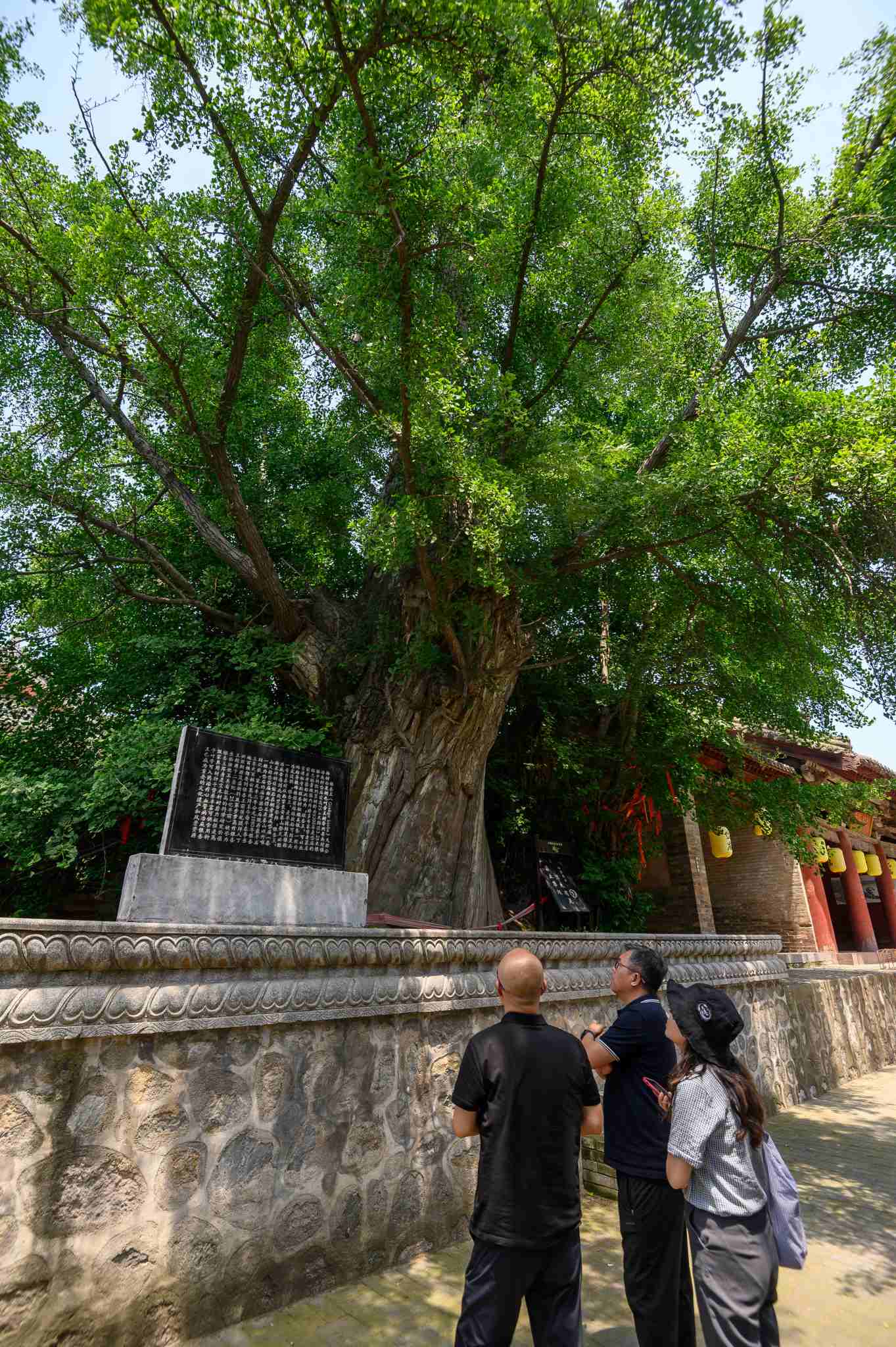 2023年6月9日,山西省晉城市,游客在古村落冶底村參觀古銀杏樹。據(jù)樹旁碑文記載,這棵銀杏樹高25.4米,胸徑3.25米,樹齡大約為6200年。視覺中國