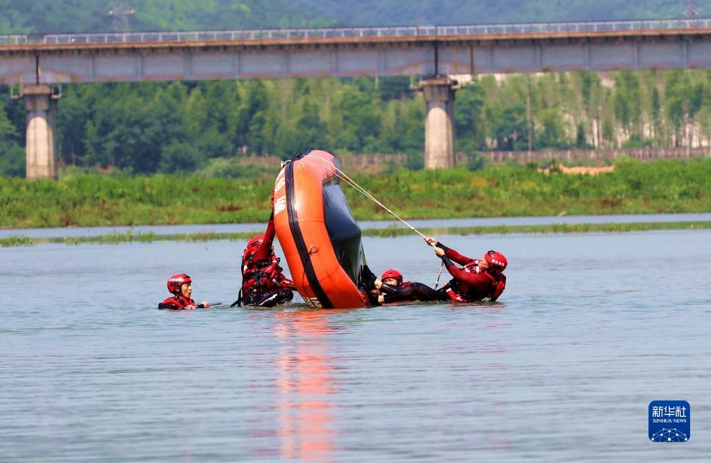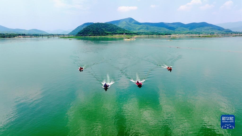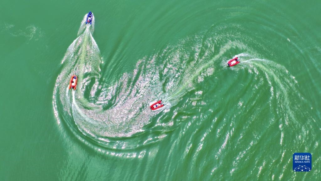 當日,在浙江省湖州市長興縣合溪水庫煤山段,煤山鎮(zhèn)組織黨員干部、應急管理隊員、志愿者組成應急救援隊,開展防汛減災應急綜合實戰(zhàn)演練,通過沖鋒舟編隊、水上打撈、水上救援等課目訓練,增強防汛應急處置和水上搶險救災能力。新華社發(fā)(許旭 攝)