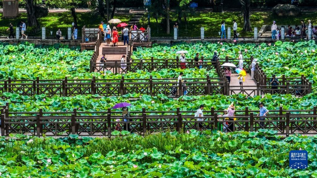 6月10日,游人在南寧市南湖之濱荷花池參觀游覽(無人機(jī)照片)。