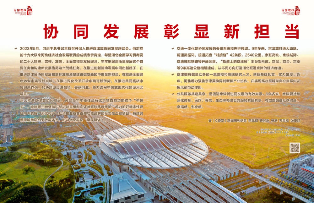 2023年5月,習(xí)近平總書記主持召開深入推進(jìn)京津冀協(xié)同發(fā)展座談會。他對黨的十九大以來河北經(jīng)濟(jì)社會發(fā)展取得的成績表示肯定,希望河北全面學(xué)習(xí)貫徹黨的二十大精神,完整、準(zhǔn)確、全面貫徹新發(fā)展理念,牢牢把握高質(zhì)量發(fā)展這個首要任務(wù)和構(gòu)建新發(fā)展格局這個戰(zhàn)略任務(wù),在推進(jìn)創(chuàng)新驅(qū)動發(fā)展中闖出新路子,在推進(jìn)京津冀協(xié)同發(fā)展和高標(biāo)準(zhǔn)高質(zhì)量建設(shè)雄安新區(qū)中彰顯新?lián)?dāng),在推進(jìn)全面綠色轉(zhuǎn)型中實現(xiàn)新突破,在推進(jìn)深化改革開放中培育新優(yōu)勢,在推進(jìn)共同富裕中展現(xiàn)新作為,加快建設(shè)經(jīng)濟(jì)強省、美麗河北,奮力譜寫中國式現(xiàn)代化建設(shè)河北篇章。