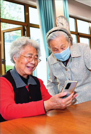 老人在位于河北三河的燕達(dá)金色年華健康養(yǎng)護(hù)中心老年活動室交談(2022年5月18日攝)朱旭東攝 / 本刊
