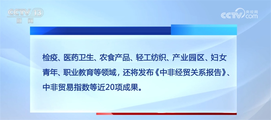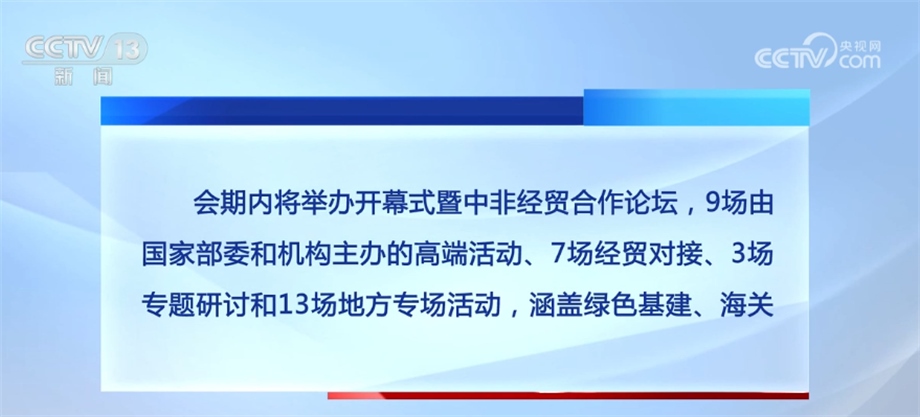 會(huì)期內(nèi)將舉辦開(kāi)幕式暨中非經(jīng)貿(mào)合作論壇,9場(chǎng)由國(guó)家部委和機(jī)構(gòu)主辦的高端活動(dòng)、7場(chǎng)經(jīng)貿(mào)對(duì)接、3場(chǎng)專題研討和13場(chǎng)地方專場(chǎng)活動(dòng),涵蓋綠色基建、海關(guān)檢疫、醫(yī)藥衛(wèi)生、農(nóng)食產(chǎn)品、輕工紡織、產(chǎn)業(yè)園區(qū)、婦女青年、職業(yè)教育等領(lǐng)域,還將發(fā)布《中非經(jīng)貿(mào)關(guān)系報(bào)告》、中非貿(mào)易指數(shù)等近20項(xiàng)成果。