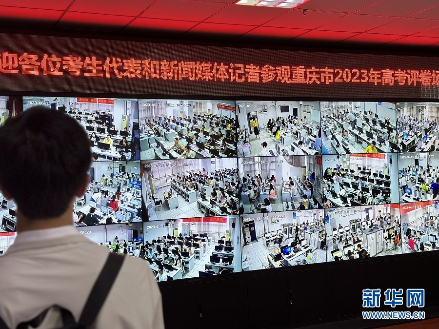 工作人員通過視頻實時監(jiān)控閱卷現(xiàn)場。新華網(wǎng) 彭浩然 攝