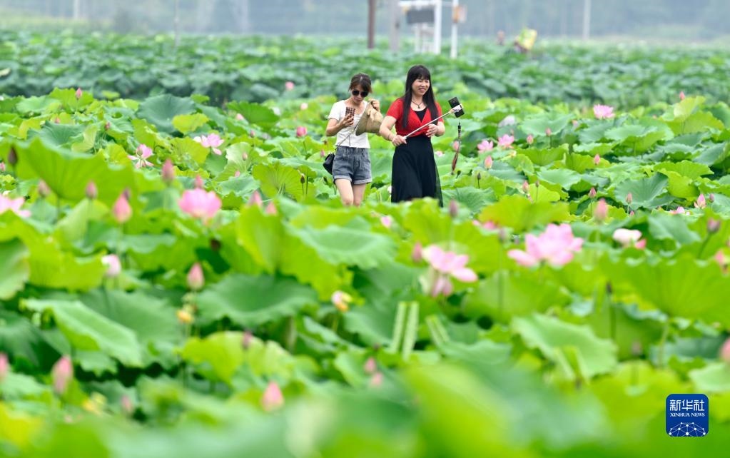 6月13日,游客在柳州市柳江區(qū)百朋鎮(zhèn)萬(wàn)畝荷塘里游玩。