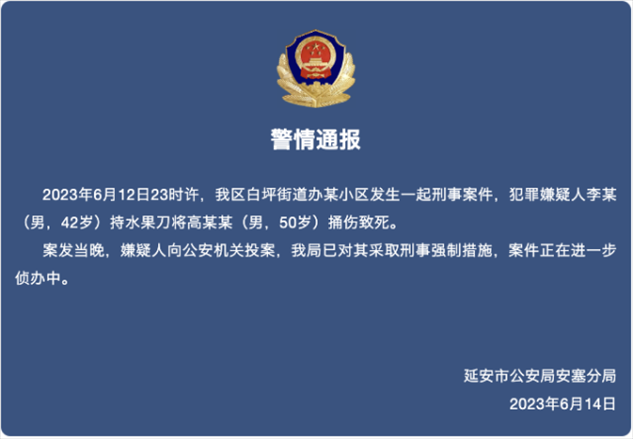 ·陜西延安一男子持水果刀將人捅傷致死,警方通報。