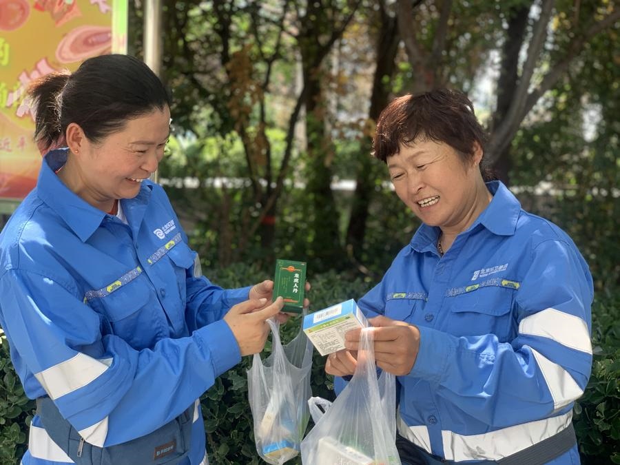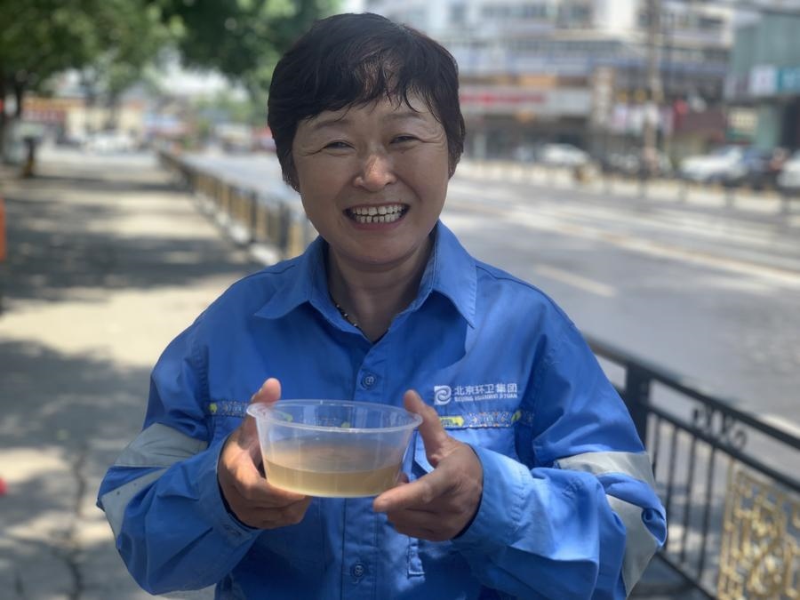 環(huán)衛(wèi)管理部門為環(huán)衛(wèi)工準(zhǔn)備了綠豆水和防暑藥品。