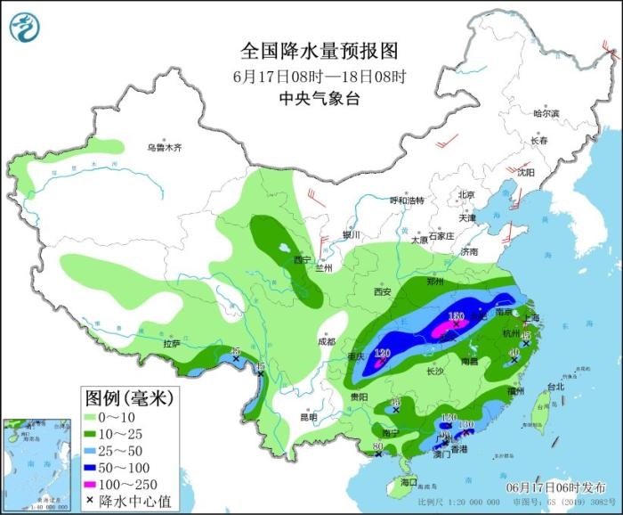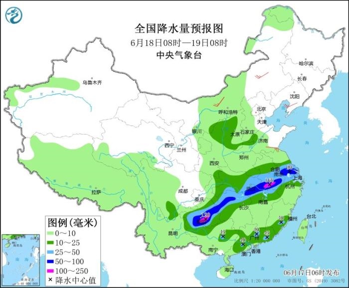 17日至19日,西南地區(qū)東部、江漢、江淮、江南、華南等地有大范圍較強(qiáng)降雨過程,部分地區(qū)有大到暴雨,局地大暴雨,并伴有短時(shí)強(qiáng)降水、雷暴大風(fēng)等強(qiáng)對(duì)流天氣。其中,6月17日08時(shí)至18日08時(shí),江淮大部、江漢大部、湖南北部、重慶中東部、貴州北部、廣西北部和南部沿海、廣東中南部、福建南部以及西藏東南部、云南西北部等地部分地區(qū)有大到暴雨,其中,湖北東部、重慶東南部、貴州東北部、廣東中南部等地部分地區(qū)有大暴雨(100~150毫米)。上述部分地區(qū)伴有短時(shí)強(qiáng)降水(最大小時(shí)降雨量20~60毫米,局地可超過70毫米),局地有雷暴大風(fēng)等強(qiáng)對(duì)流天氣。中央氣象臺(tái)6月17日06時(shí)繼續(xù)發(fā)布暴雨藍(lán)色預(yù)警。